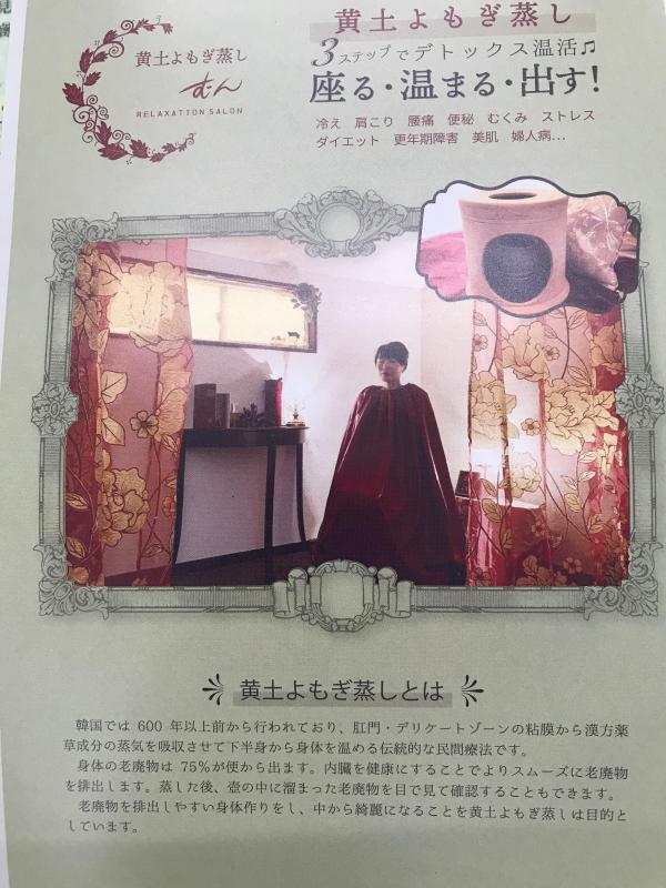 冷え、肩こり、腰痛、便秘、むくみ、ストレス、ダイエット、更年期障害、美肌、婦人病などに黄土よもぎ蒸しは幅広く効果が期待できる。。。と紹介まではさせて頂きました。
