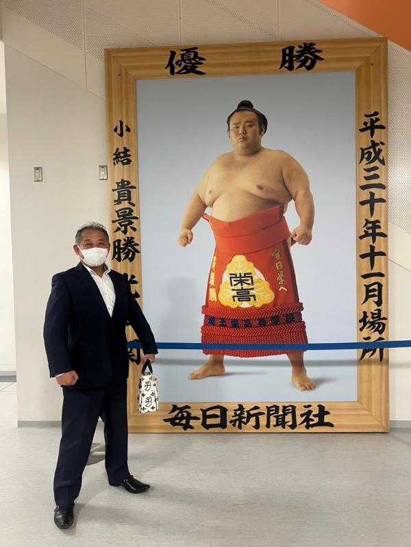 この前引退した貴景勝関の国技館にあった写真の前で写真を撮らせていただきました